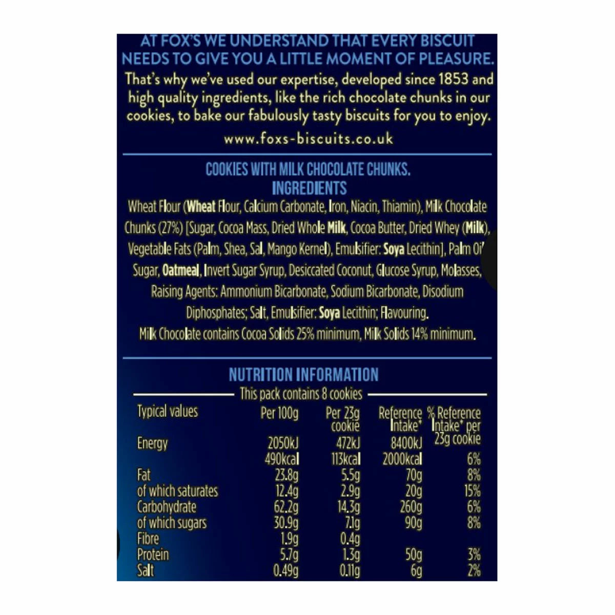 This Pack of Fox's Fabulous Cookies offers 4 packs of Fox’s Fabulous Triple Chocolate Cookies and 4 Packs of Fox's Milk Chocolate Cookies. Fox’s understands that every biscuit needs to give you a little moment of pleasure, and Fox's use expertise, developed since 1853, and high quality ingredients, to bake the fabulously tasty biscuits for you to enjoy.