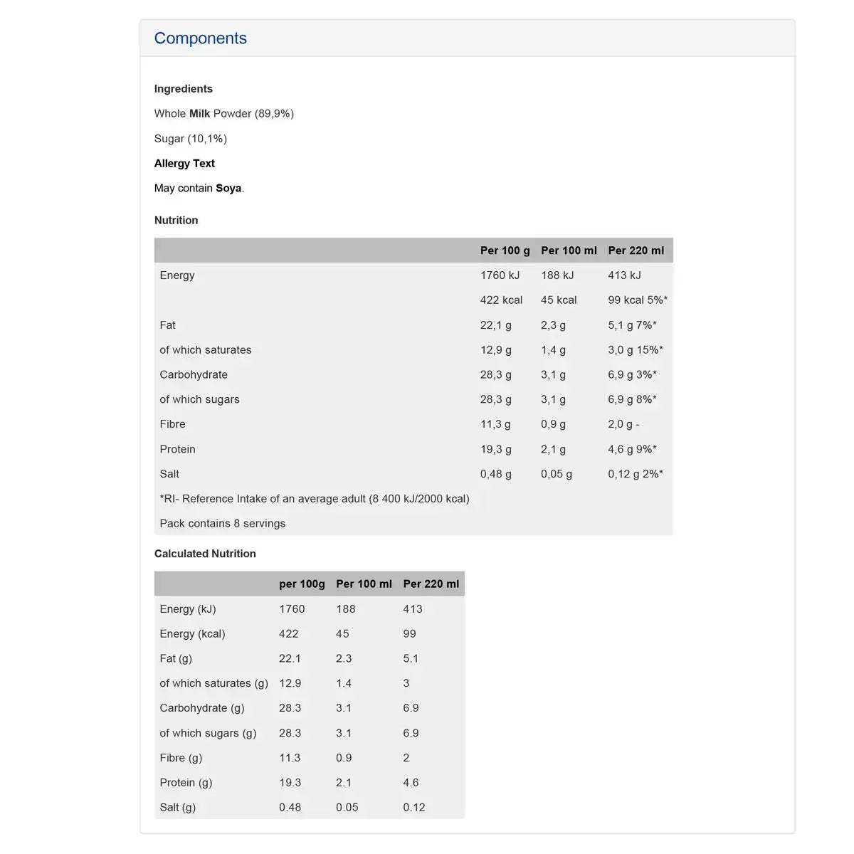 Ingredients: Whole Milk Powder, Sugar, Emulsifier (Soya Lecithin), Roast & Ground Coffee