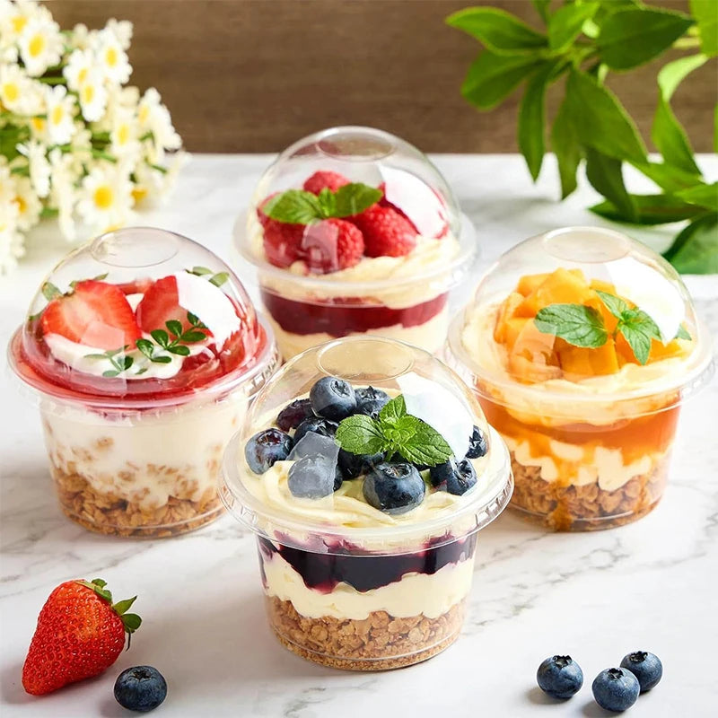 Perfect for cafés, bubble tea shops, and beverage service, this 50-piece set delivers reliable, professional-grade disposable cups. Each transparent plastic cup pairs with either a dome or flat lid, allowing flexibility for hot and cold drinks. The crystal-clear design showcases your beverages while maintaining structural integrity. Ideal for high-volume operations seeking cost-effective, hygienic serving solutions without compromising on presentation.